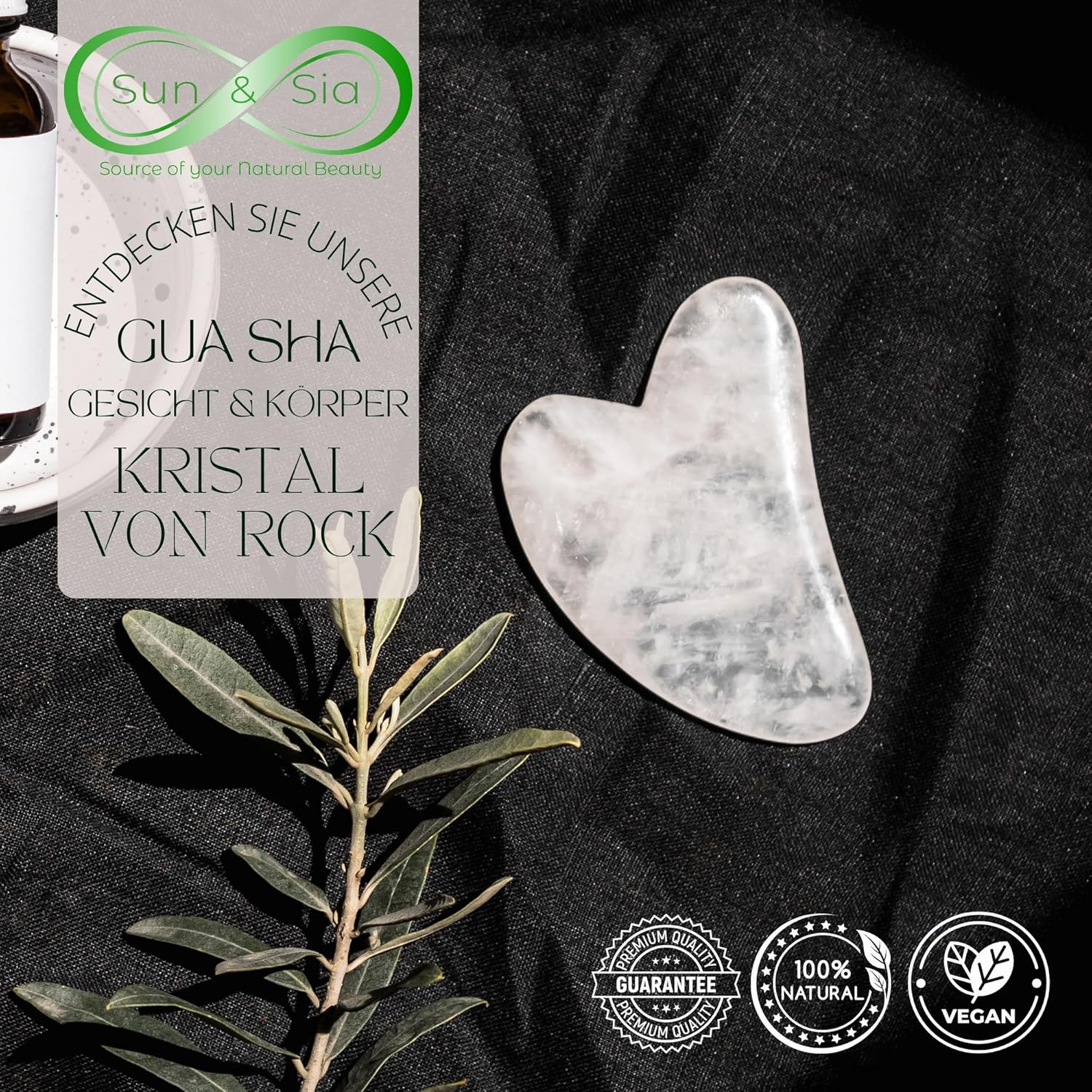 Entdecken Sie unseren Gua Sha aus 100 % natürlichem Bergkristall mit stilvoller Schutzhülle - aus der Sun & Sia Kollektion von Zen Arôme – ein Werkzeug, das seit Jahrhunderten in der Hautpflege & Massagekunst geschätzt wird. Ideal für Gesicht und Körper, um Verspannungen zu lösen, den Teint zum Strahlen zu bringen und ein ausgeglicheneres Hautbild zu fördern.