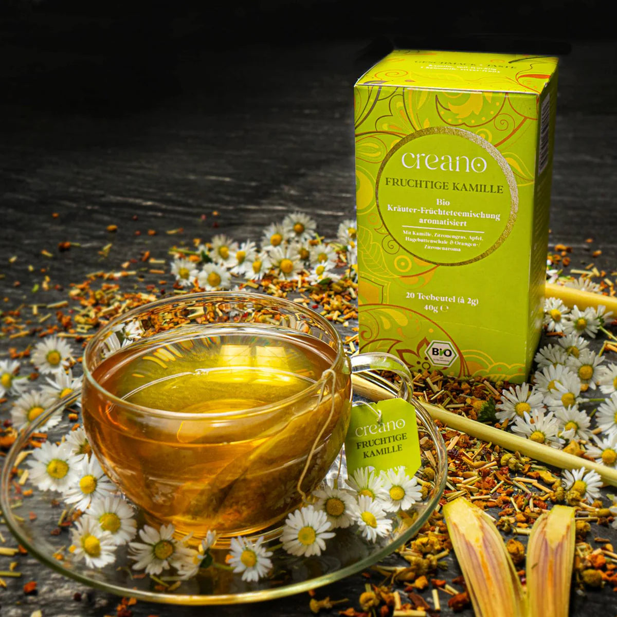 Creano fruchtige Kamille ist eine leichte, süss-fruchtige Kräuter- und Früchteteemischung mit Kamille, Zitronengras und Fruchtschalen. Sie wirkt entspannend, schmeckt frisch wie ein milder Sommertag und ist dank natürlicher Süsse auch bei Kindern beliebt – heiss oder kalt geniessbar.