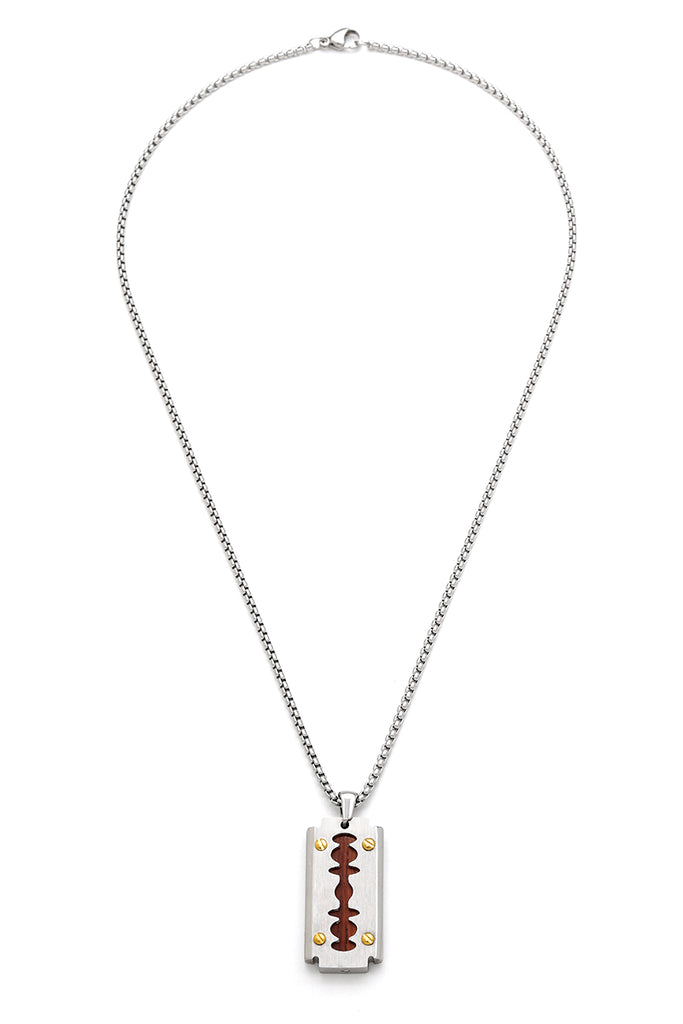 Diese Herren Edelstahlkette ist nicht nur hochwertig, sondern auch trendy und hat dennoch einen coolen, zeitlosen Look! Manche Schmuckstücke sind einfach wie gemacht für lockere Stylings und Fashions. Die Länge dieser coolen Edelstahlkette mit Rasierklinge aus Edelstahl und Holz kann von 45 cm bis 50 cm erstellt sein.